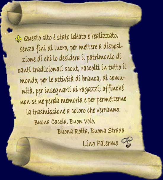 «Fratello guarda, nel cuore del bosco, su una radura, fra i pini, tu scorgi qualcosa: sono ombre nere attorno al chiarore d'un fuoco, sono volti riverberati dalla luce rossa della fiamma, sono giovani che portano la tua stessa divisa: sono scout. Ferma il tuo passo che fa' scricchiolare i tralci secchi e spezza i fuscelli caduti ed ascolta: dal cerchio si innalza un canto: ed il vento lo porta a morire tra le ombre, lontano. Un canto che parla di tanta speranza e di tanta attesa, che intreccia i ricordi di un ieri giocondo con la mestizia d'un oggi di ombra. Sono canti nati tra il verde del bosco e sanno di resina, sulle vette splendenti dei monti e sanno di luce, o sulle strade polverose d'Italia e c'e' il ritmo di un passo di giovinezze in cammino. Sono canti sorti quando moriva la brace ed il buio si faceva piu' cupo: li abbiamo cantati cosi' piu' adagio, con voce velata: pensando ai fratelli dispersi o perduti lungo la strada, ai fratelli caduti lontano, invocando la mamma... ed era preghiera. Sono canti sgorgati improvvisi, senz'ordine. Forse puoi trovarvi l'eco di altre canzoni: accettali cosi come sono e, aldila' delle note e delle parole, sappi scorgere l'animo di chi un giorno li ripeteva mentre attorno v'era tanta tristezza. Ora te li offriamo perche' li possa cantare pur tu nella libera e gioconda vita che hai scelto: la vita scout, fratello, che altri ti hanno preparato tenendo accesa la fiamma, questa tua vita scout che e' tra i piu' bei doni di Dio: perche' sa di letizia e di bonta' perche' pur essa e' un canto di gioia.